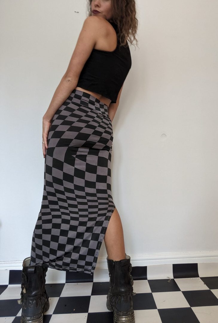 Our maxi skirt design in the slinkiest grey chequered fabric.